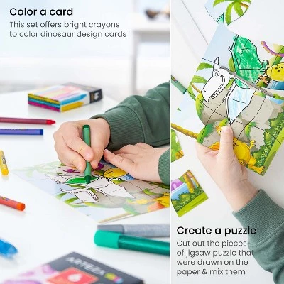 Encourage a child in your life to create their own puzzle with this Dinosaur Puzzle Set. Arteza’s kids jigsaw puzzle set comes complete with five dinosaur design cards, five frames, 16 crayons (in assorted colors), and six glitter glue sticks! This DIY jigsaw puzzle set makes a memorable birthday or holiday gift for young artists. Our Dinosaur Puzzle Set invites children to color their prehistoric designs then add a splash of sparkle with the included glitter glue sticks. After your child pieces together their puzzle, you’re invited to frame and proudly display their work of art. This Dinosaur Puzzle Set makes a wonderful addition to any home, classroom, daycare, or even waiting room. ⚠  WARNING:CHOKING HAZARD – Small parts. Not for children under 3 yrs.