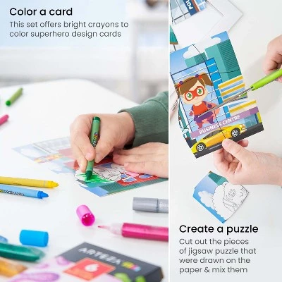 - Everything is Included – Comes complete with 5 superhero cards, 5 frames, 16 crayons, and 6 glitter glue tubes