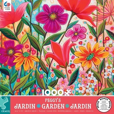 This 1000 piece Peggy’s Garden puzzle features a bold and vibrant illustration, by the artist Peggy Davis. A lush rendition of a bright and sunny flower garden filled with orange and pink hues. The puzzle’s dimensions are 26.6 inches x 19 inches. Count on Ceaco for the most Creative, Exciting, and Colorful puzzles since 1987.