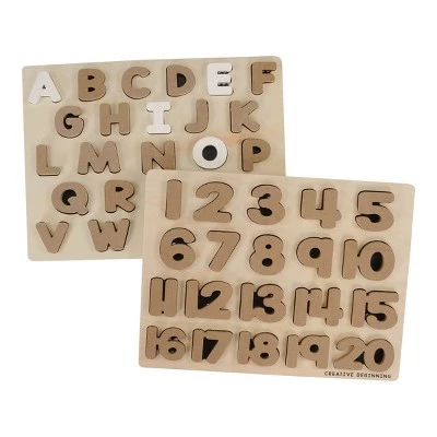 Encourage children to practice early handwriting and number formation, while reinforcing letter and number recognition, with this Chalkboard-Based Alphabet & Number Puzzle Set! Each puzzle consists of a chalkboard base with tracers and indented spaces, allowing the child to practice printing letters and numbers without “going out of the lines.” Use the indented spaces to trace the shapes of the letters or numbers with their fingers, or use a piece of chalk to print, erase, and practice again and again! Puzzles are manufactured with high-quality sealed wood and non-toxic paint in neutral colors. Chalk not included. Each puzzle measures 16″ x 12″ x 2″.