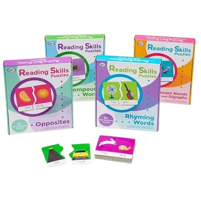 This full set of four Reading Skills Puzzles includes Rhyming Words, Compound Words, Consonant Blends and Digraphs, and Opposites. Each game includes 30 colorful two-piece puzzles. Grades 1-3. Rhyming Words – With colorful illustrations, these two-piece puzzles help students with word recognition as well as vocabulary development and rhyming. Compound Words – Improve vocabulary with these two-piece puzzles featuring colorful illustrations. A great way to teach compound words. Consonant Blends & Diagraphs – These colorful two-piece puzzles help students to recognize basic blends and digraphs. Opposites – Match these 30 colorful, two-piece puzzles to identify opposites such as full/empty and front/back.