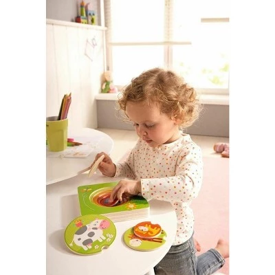Say hello to your friends down on the farm! Children will have wild fun with this wooden puzzle, learning to recognize colors and different shape dimensions at the same time. The puzzle pieces are fitted in the puzzle board notches according to size. Contents: one puzzle board, 5 puzzle disks. Measures: 6″ x 6″ w x 1″ HABA is a German company with a long history of deep commitment to high-quality design, safety and social & environmental responsibility. This item is designed in Germany and made with strict care in China. Our employees regularly visit and inspect our partner suppliers and hold them to the highest quality standards and working conditions. Prior to market placement, the safety of the materials, the engineering process, the mechanical endurance testing and the actual use of our products are all tested and documented by independent, third party testing institutes. Cleaning Instructions: HABA recommends using a cloth lightly dampened with warm water. If you wish to disinfect the toy with a cleaning agent, use a small amount of either water and a mild dish soap or a water & vinegar essence mix. Both options work extremely well in destroying bacteria and cleaning wooden toys. After cleaning, wipe the toy dry with a clean cloth. Remember, Wood is a natural material that soaks in moisture. Do not ever submerse wooden toys in water or place in a dishwasher. Disinfectants (even organic baby wipes), should not be used as they can damage the water based protective coatings applied to protect the stains or paints beneath.
