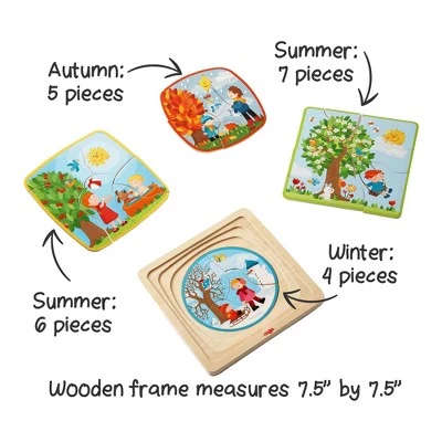 - Four separate puzzles on one board! Starting with Winter – 4 pieces, Fall – 5 pieces, Spring – 6 pieces and Summer – 7 pieces.