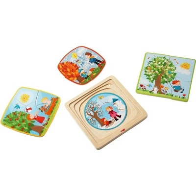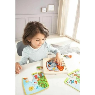 Spring, summer, fall and winter … the puzzle-piece children experience something new every season. Who wants to join in their adventure? Individual puzzle pieces are puzzled on top of each other into the puzzle board recesses. That’s fun! And trains fine motor skills along the way. HABA is a German company with a long history of deep commitment to high-quality design, safety and social & environmental responsibility. This item is designed in Germany and made with strict care in China. Our employees regularly visit and inspect our partner suppliers and hold them to the highest quality standards and working conditions. Prior to market placement, the safety of the materials, the engineering process, the mechanical endurance testing and the actual use of our products are all tested and documented by independent, third party testing institutes. Cleaning Instructions: HABA recommends using a cloth lightly dampened with warm water. If you wish to disinfect the toy with a cleaning agent, use a small amount of either water and a mild dish soap or a water & vinegar essence mix. Both options work extremely well in destroying bacteria and cleaning wooden toys. After cleaning, wipe the toy dry with a clean cloth. Remember, Wood is a natural material that soaks in moisture. Do not ever submerse wooden toys in water or place in a dishwasher. Disinfectants (even organic baby wipes), should not be used as they can damage the water based protective coatings applied to protect the stains or paints beneath.