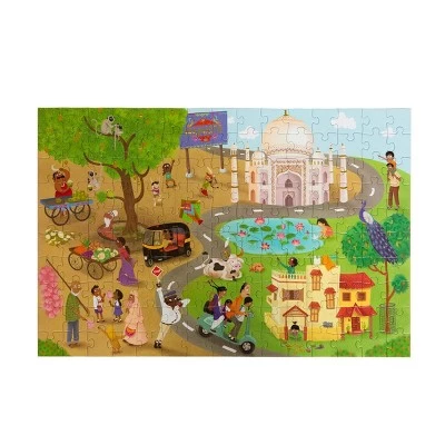 - Colorful puzzle featuring Taj Mahal, tuk-tuk, kite lotuses, peacock, mangoes, cricket, and diverse Indian life
