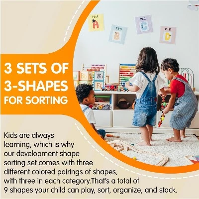 - 3 SETS OF 3-SHAPES FOR SORTING: Kids are always learning, which is why our development shape sorting set comes with three different colored pairings of shapes, with three in each category. That’s a total of 9 shapes your child can play, sort, organize, and stack. Watch their eyes light up as they focus on their sorting
