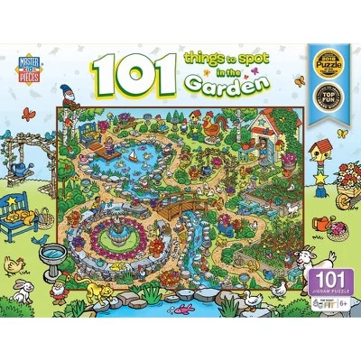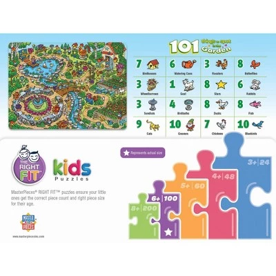 - Let the search begin with this 101 Things to Spot in the Garden puzzle. Can you find them all? Good luck! This puzzle is 101 pieces and 19 inches x 14 inches in size. Look for The Right Fit® puzzles collection and make sure your little one gets the correct piece count and size for a good challenge for their age. This puzzle is the right fit for ages 6+.