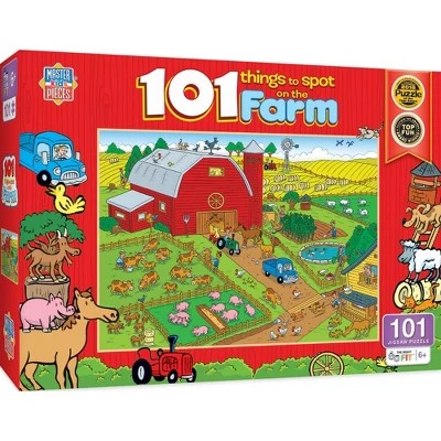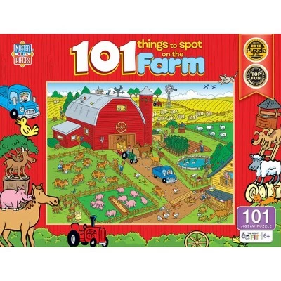 - Let the search begin with this 101 Things to Spot on the Farm puzzle. There are 101 things to spot underwater, from pigs to sheep and even tractors. Can you find them all? Good luck! This puzzle is 101 pieces and 19 inches x 14 inches in size. Look for The Right Fit® puzzles collection and make sure your little one gets the correct piece count and size for a good challenge for their age. This puzzle is the right fit for ages 6+.