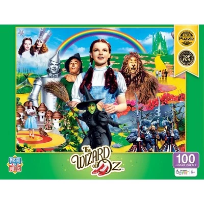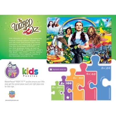 The Wizard of Oz puzzle features Dorothy, Scarecrow, Tin Man, and Cowardly Lion in different scenes, just watch out for the Wicked Witch! |This puzzle is 100 pieces and 19 inches x 14 inches in size. Look for The Right Fit® puzzles collection and make sure your little one gets the correct piece count and size for a good challenge for their age.