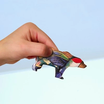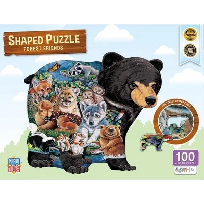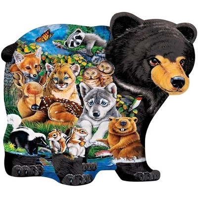 - Shaped puzzle features a black bear and all his forest friends