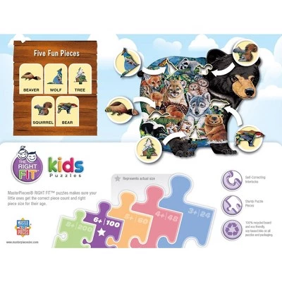 This Forest Friends Shaped puzzle features a black bear and all his forest friends. This puzzle is 100 pieces and 17.5 inches x 15.5 inches in size. Look for The Right Fit® puzzles collection and make sure your little one gets the correct piece count and size for a good challenge for their age. This puzzle is the right fit for ages 6+.