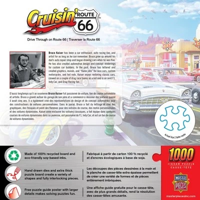 - This MasterPieces 19.25″ x 26.75″ 1000pc Cruisin’ Puzzle is perfect for all vintage car fanatics! Artists Bruce Kaiser and Hiroaki Shioya bring the 50’s nostalgic scene to life with their vivid depictions of Hot Rods and smoking tires. Hot Rods make a pit stop at the drive in diner on Route 66, this puzzle is the perfect gift for anyone who appreciates the good old days! To reduce its impact on our environment, the chipboard used in this puzzle is made of recycled material.