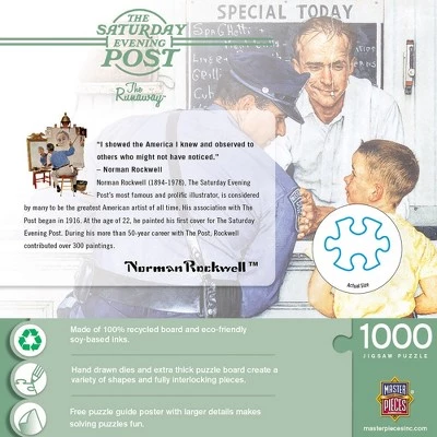 - This MasterPieces Norman Rockwell – Saturday Evening Post 19.25″ x 26.75″ 1000pc Puzzle is sure to become a family favorite. Norman Rockwell began his career in 1916 with The Saturday Evening Post. His heartwarming and humorous illustrations of everyday American life appeared on the cover of the magazine for more than 50 years and contributed over 300 paintings. With it’s sweet depiction of a little boy running away from home, but first stopping by the local diner for a quick soda, this Norman Rockwell – Saturday Evening Post image is sure to have everyone reminiscing about the good old days. To reduce its impact on our environment, the chipboard used in this puzzle is made of recycled material.