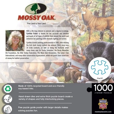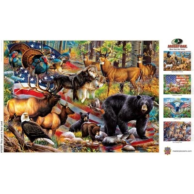 These MasterPieces 19.25″ x 26.75″ 1000pc Mossy Oak Puzzle of Family of Deer under the American flag. To reduce their impact on our environment, the chipboard used in these puzzles is made of recycled material.