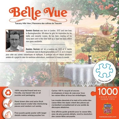 - This MasterPieces 19.25″ x 26.75″ 1000 Piece Puzzle is the perfect blend of exciting and adorable. Enjoy a glass overlooking the beautiful Tuscan Hills . To reduce its impact on our environment, the chipboard used in this puzzle is made of recycled material.
