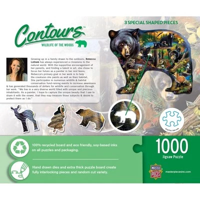 - This 1000pc Bear shaped puzzle. Woodland animals make a home. Includes three special shaped pieces hand-drawn into the dieline. To reduce their impact on our environment, the chipboard used in these puzzles is made of recycled material.