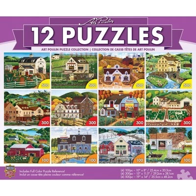 This MasterPieces 12-Pack Art Poulin Puzzle Bundle features beautiful folk art scenes, painted by talented folk artist, Art Poulin. This puzzle pack includes a fold-out giant panoramic poster of all 12 images, each puzzle has a custom pattern on the back to make it easy to keep puzzles organized, and the entire pack includes 4 – 100pc puzzles, 4 – 300pc puzzles, and 4 – 500pc puzzles. Our 12-Pack puzzle bundle is sure to provide hours of entertainment for you and your family, and is the perfect gift for any puzzle lover! To reduce their impact on our environment, the chipboard used in these puzzles is made of recycled material.