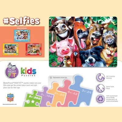 This Selfies puzzle of Barnyard Besties is the perfect challenge for older kids. Barnyard Besties features all the farm animals getting together to take a besties selfie. This puzzle is 200 pieces and 19 inches x 14 inches in size. Look for The Right Fit® puzzles collection and make sure your little one gets the correct piece count and size for a good challenge for their age. This puzzle is the right fit for ages 8+.