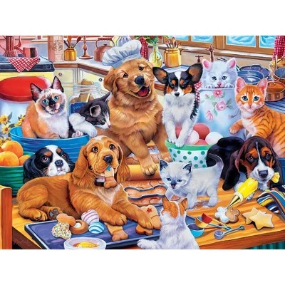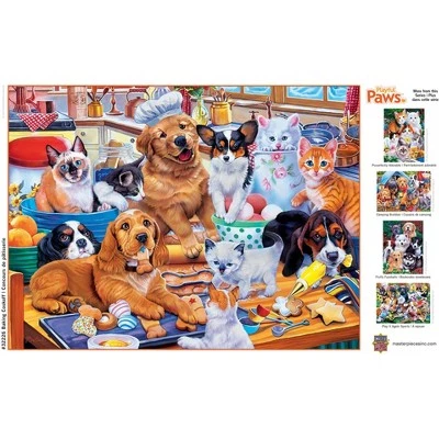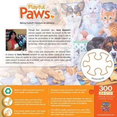 This MasterPieces 18″ x 24″ Playful Paws 300PC EZ Grip Puzzle is the perfect blend of exciting and adorable kittens. Mischief mixes with sweetness perfectly when these puppies and kittens get in the kitchen for a Bake-Off. The bone-shaped cookies are sure to impress. These cute bakers will steal your heart with their adorable faces and tasty treats.. Through their remarkable eyes, Jenny Newland’s precious puppies and kittens are brought to life with colorful detail and sweet expressions. Jenny is able to capture the personalities of her adorable subjects so well, because she and her family are surrounded at home by four dogs, fifteen cats, and various farm animals. Each puzzle has extra-large pieces for a fun and quick night of puzzling with the family or group of friends. The EZ-Grip die-cut used to make this puzzle offers larger puzzle pieces for easier visual and grip that snap together perfectly, without compromising image quality. To reduce their impact on our environment, the chipboard used in these puzzles is made of recycled material.