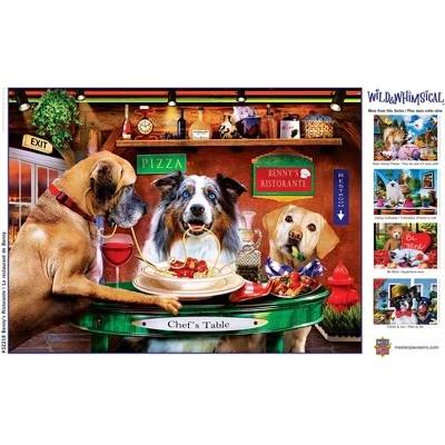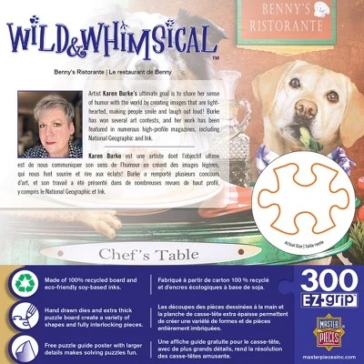 MasterPieces’ 18″ x 24″ Wild & Whimsical 300PC EZ Grip Puzzle is the perfect blend of exciting and adorable. Some furry friends get a taste of Italy. The chef’s special is served for VIP doggy guests in this fun puzzle. Only the finest cuisine for these good dogs! The EZ-Grip die-cut used to make this puzzle offers larger puzzle pieces for easier visual and grip that snap together perfectly, without compromising image quality. To reduce their impact on our environment, the chipboard used in these puzzles is made of recycled material.