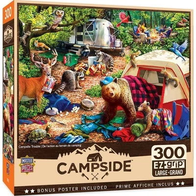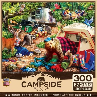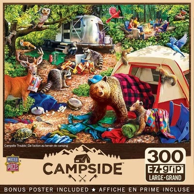 This MasterPieces 18″ x 24″ 300EZ Grip Campside puzzle was painted by Larry Jones. Enjoy the mischief of a evening at the campground when furry friends come and join the party. To reduce its impact on our environment, the chipboard used in this puzzle is made of recycled material.