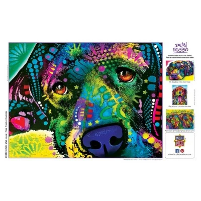 This MasterPieces 18″ x 24″ Dean Russo 300PC EZ Grip Puzzle with these adorable sad eyes hiding behind the cutest cold wet puppy nose. Dean Russo Art Studio has a sincere dedication to animal rescue, and has participated in charity auctions, donations and fund-raising events. Through inspiring messages and bright prints, Dean Russo’s work is sure to brighten anyone’s day. Each puzzle has extra large pieces for a fun and quick night of puzzling with the family or group of friends. The EZ-Grip technology used to make this puzzle offers larger puzzle pieces that snap together perfectly, without compromising image quality. To reduce its impact on our environment, the chipboard used in this puzzle is made of recycled material.