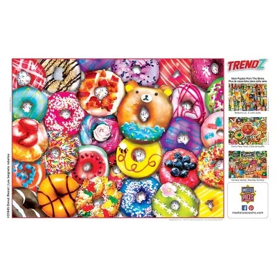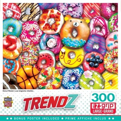 This MasterPieces 18″ x 24″ 300pc EZ Grip Trendz Collection features hip images of favorable styles, or influences we see trending today. Donut Resist puzzle collages a variety of mouth-watering sweet donuts with different flavors, and unique designs. Have yourself a donut that looks like a basketball or an unusual combination like a bacon donut or one with fruity pebbles cereal. Yum! Itβs sure to have you craving a donut. The EZ-Grip die-cut used to make this puzzle offers larger puzzle pieces that snap together perfectly, without compromising image quality. To reduce its impact on our environment, the chipboard used in this puzzle is made of recycled material.