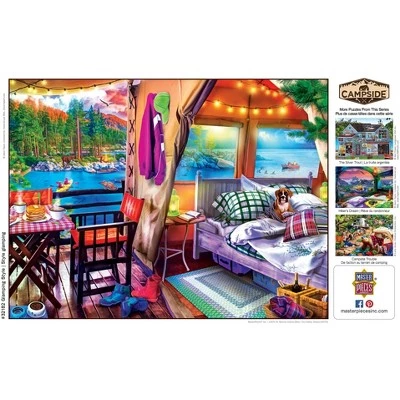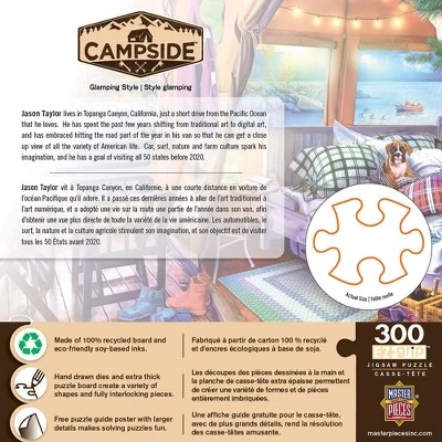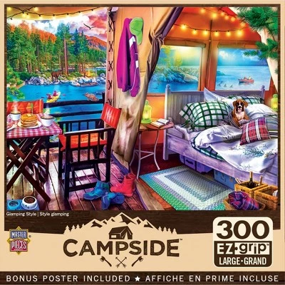 - This MasterPieces 18″ x 24″ 750pc Campside puzzle living the high life Glamping with the family… even better then camping. Enjoy the mischief of a evening at the campground when furry friends come and join the party. To reduce its impact on our environment, the chipboard used in this puzzle is made of recycled material.