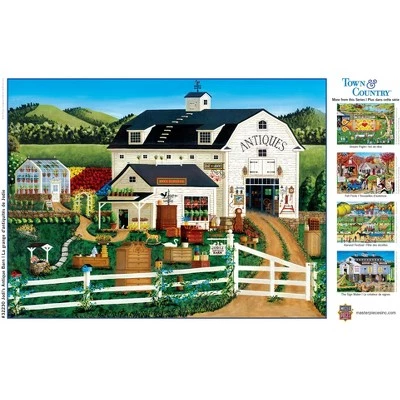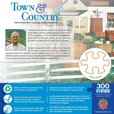 This MasterPieces 18″ x 24″ 300PC EZ Grip Town & Country Puzzle is the perfect way to sit back, relax, and enjoy the simple pleasures in life. With featured art of the incredibly talented folk artist, Art Poulin. This charming folk art puzzle depicts a nostalgic scene. Jodi’s Antique Barn at the side of the country road has fresh flowers to go with every purchase. Page through a rare book or toss a coin in the wishing well as you wander amongst the bureaus and end tables. Jodi has something for everyone! The EZ-Grip die-cut used to make this puzzle offers larger puzzle pieces for easier visual and grip that snap together perfectly, without compromising image quality. To reduce their impact on our environment, the chipboard used in these puzzles is made of recycled material.