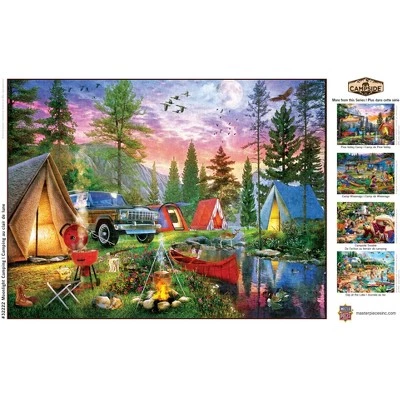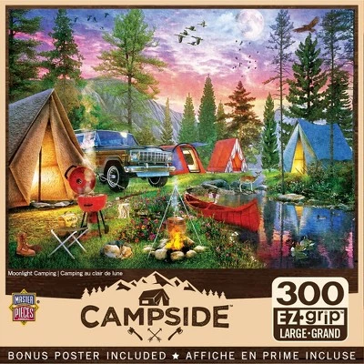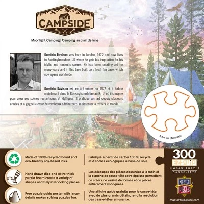 This MasterPieces 18″ x 24″ 300EZ Grip Campside puzzle was painted by Dominic Davison. Gather under a full moon around the campfire as the sunset fades in the sky. Enjoy today’s catch and the warmth of a crackling fire. Finally, retire for the night in a cozy tent and let the sound of the babbling stream lull you to sleep.. To reduce its impact on our environment, the chipboard used in this puzzle is made of recycled material.
