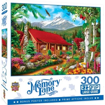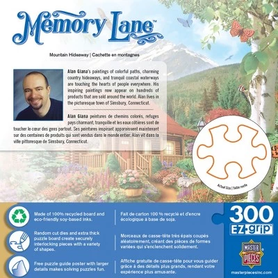 This MasterPieces 18″ x 24″ Memory Lane 300PC EZ Grip Puzzle depicts a red-roofed log cabin, nestled behind a colorful and woodsy garden, with a spectacular view of the mountains in the background. It was painted by the talented Alan Giana, whose paintings of colorful paths, charming country hideaways, and tranquil coastal gateways are touching the hearts of people everywhere. His inspiring paintings now appear on hundreds of products that are sold around the world. Alan lives with his loving wife, Pamela, in the picturesque town of Simsbury, Connecticut. The EZ-Grip technology used to make this puzzle offers larger puzzle pieces that snap together perfectly, without compromising image quality. To reduce its impact on our environment, the chipboard used in this puzzle is made of recycled material.
