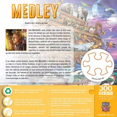 This MasterPieces 18″ x 24″ Medley 300PC EZ Grip Puzzle. Bright and beautiful family of animals travels the seas on Noah’s Ark. The EZ-Grip technology used to make this puzzle offers larger puzzle pieces that snap together perfectly, without compromising image quality. To reduce its impact on our environment, the chipboard used in this puzzle is made of recycled material.