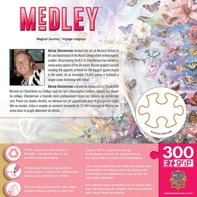 This MasterPieces 18″ x 24″ Medley 300PC EZ Grip Puzzle. Bright and colorful and sparkling in the wind, butterflies join power with the Unicorn spirit. The EZ-Grip technology used to make this puzzle offers larger puzzle pieces that snap together perfectly, without compromising image quality. To reduce its impact on our environment, the chipboard used in this puzzle is made of recycled material.