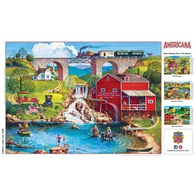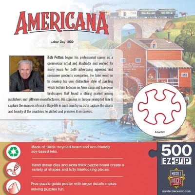 This MasterPieces 26.75×19.25″ 500pc EZ Grip Puzzle was painted by Bob Pettes. One of the most beloved American folk artists, Bob Pettes paints quaint pictures of the American lifestyle of the early 1900’s. Nostalgic and colorful these images are true American folk art classics. The EZ-Grip technology used to make this puzzle offers larger puzzle pieces that snap together perfectly, without compromising image quality. To reduce its impact on our environment, the chipboard used in this puzzle is made of recycled material.