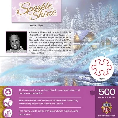 - This MasterPieces 15″ x 21″ 500pc Holiday Glitter Puzzle is the perfect way to get into the holiday spirit, and the perfect Christmas present for friends and family. This beautiful work of art is enhanced with a glitter layer to give it an extra special touch, without leaving a glittery mess behind. To reduce its impact on our environment, the chipboard used in this puzzle is made of recycled material.