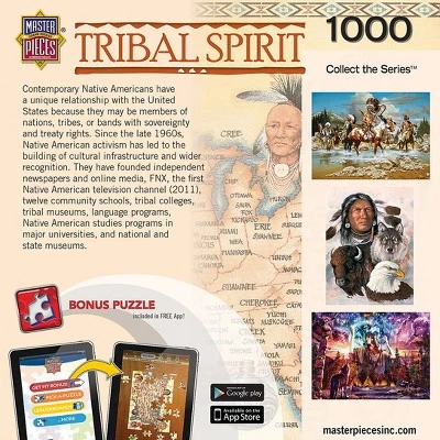 This MasterPieces 18″ x 24″ 550pc Tribal Spirit Puzzle pays homage to the rich culture and long history of America’s Native American Indian Tribes. The Tribal Spirit Puzzle Line portrays Native American traditions and ceremonies with an almost reverent accuracy. With an incredibly detailed map showing all the settlements of our nation’s Native American Indian Tribes, this puzzle will both educate and entertain! To reduce its impact on our environment, the chipboard used in this puzzle is made of recycled material.