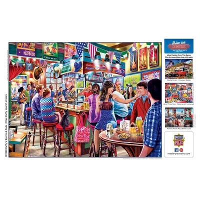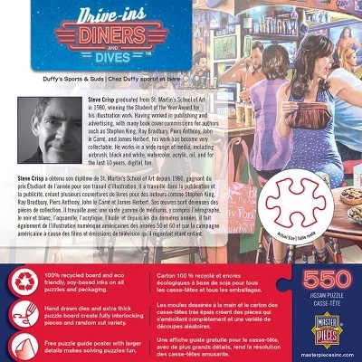 These MasterPieces 24″ x 18″ 550PC of Drive-Ins, Diners and Dives are fun nostalgia puzzles. Take yourself back to a simpler time where classic cars rules the road and be-bop on the airwaves. Classic Diners and Drive Ins still rules Friday night fun and even the occasional Dive. To reduce their impact on our environment, the chipboard used in these puzzles is made of recycled material.