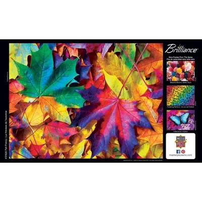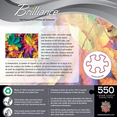 This MasterPieces 24″ x 18″ 550PC Brilliance Puzzle captures the brilliance of life. “Fall Frenzy” features an exciting frenzy of fall leaves. Temperature, light, and water supply have an influence on the degree and duration of fall leaf color. Low temperatures above freezing promote anthocyanin formation, producing bright red leaves; however, early frost will weaken the brilliant red coloring. Rainy or overcast days tend to increase the intensity of fall colors. To reduce its impact on our environment, the chipboard used in this puzzle is made of recycled material.