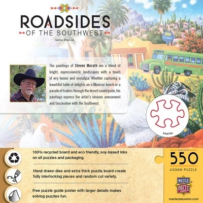 - These MasterPieces 24″ x 18″ 550PC Roadsides puzzles are created by the talented Steven Morath. Whether capturing a bountiful table of delights on a Mexican beach or a parade of trailers through the desert countryside, his paintings express the artist’s obvious amusement and fascination with the Southwest. To reduce their impact on our environment, the chipboard used in these puzzles is made of recycled material.