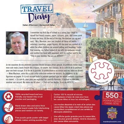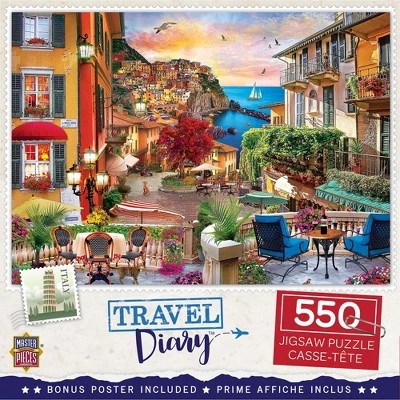 - These MasterPieces 24″ x 18″ 550PC Travel Diary puzzles. A bright sunny afternoon is perfect for a casual bite overlooking the Italian coast. To reduce their impact on our environment, the chipboard used in these puzzles is made of recycled material.