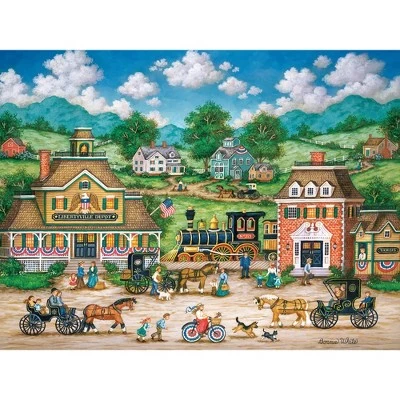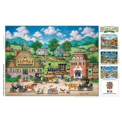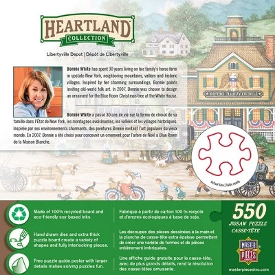 These MasterPieces 24″ x 18″ 550PC Heartland puzzles are created by the talented Bonnie White. Hustle and Bustle of the Libertyville Depot as the train comes in from the city. Inspired by the charming scenery on her family’s farm in upstate New York, as well as neighboring mountains, valleys, and historic villages, Bonnie White creates beautiful landscapes of old-world folk art and culture. The Heartland line is no exception, with beautiful, detailed scenes ranging from quiet, seaside villages to villages bustling with activity. For more Bonnie White folk art, visit her website at www.bonniewhitefolkart.com. To reduce their impact on our environment, the chipboard used in these puzzles is made of recycled material.