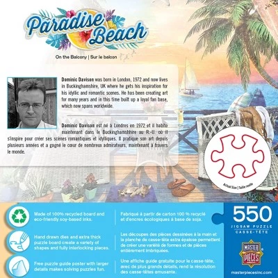 These MasterPieces 24″ x 18″ 550PCÂ puzzle.Enjoy the view from a balcony overlooking pristine blue waters as the sun sets in colorful stripes across the evening sky. Sip on a tropical drink and take in the sea breeze in this relaxing scene.. To reduce their impact on our environment, the chipboard used in these puzzles is made of recycled material.