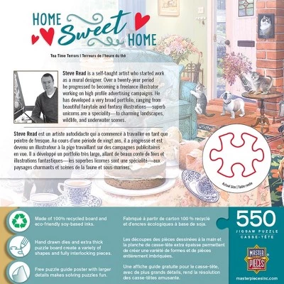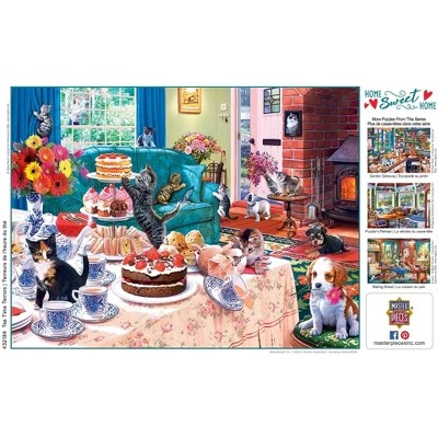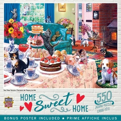 - These MasterPieces 24″ x 18″ 550PC Home Sweet Home puzzles. The kittens have taken over tea time. To reduce their impact on our environment, the chipboard used in these puzzles is made of recycled material.