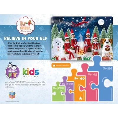 Elf on the Shelf is fun-filled Christmas tradition that has captured the hearts of children everywhere. The Believe in your Elf puzzle is 60 pieces and 19 inches x 14 inches in size. Look for The Right Fit® puzzles collection and make sure your little one gets the correct piece count and size for a good challenge for their age. This puzzle is the right fit for ages 5+.