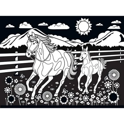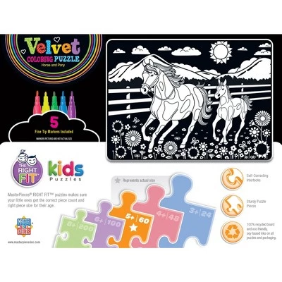 This Velvet Coloring puzzle brings together puzzling and coloring in this fun new activity for kids. Have fun piecing together the image of the two galloping horses roaming in the flowers. Once it is assembled get creative and use each of the 5 fine tip markers provided to make this image your own unique masterpiece. As you color, watch patterns appear in the image, like magic. This puzzle is 60 pieces and 19 inches x 14 inches in size. Look for The Right Fit® puzzles collection and make sure your little one gets the correct piece count and size for a good challenge for their age. This puzzle is the right fit for ages 5+.
