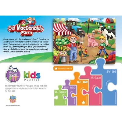 Come on down to Old MacDonald’s Farmâ„¢! In In Old Macdonald’s Farmâ„¢, farm friends and tractors work hard together, from sun-up til’ sun-down. From planting crops in the spring, to harvesting in the fall… there’s plenty to do all year ‘round! Our days are full of hard work, fun adventures, and great friends. Life on the farm is good! This puzzle is 60 pieces and 19 inches x 14 inches in size. Look for The Right Fit® puzzles collection and make sure your little one gets the correct piece count and size for a good challenge for their age. This puzzle is the right fit for ages 5+.