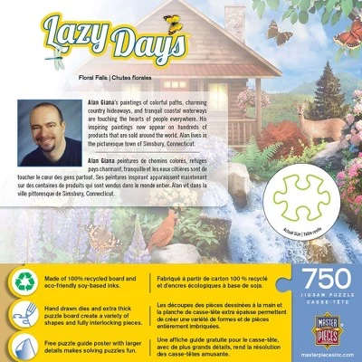 This MasterPieces 18″ x 24″ 750pc Lazy Days Puzzle was created by the talented Alan Giana. Alan Giana’s paintings of colorful paths, charming country hideaways, and tranquil coastal waterways touch the hearts of people everywhere. His inspiring paintings now appear on hundreds of products sold all around the world. The rushing stream cascades past a pristine log cabin. Thick recycled puzzle board and random cut pieces ensure a tight interlocking fit and create a fun experience