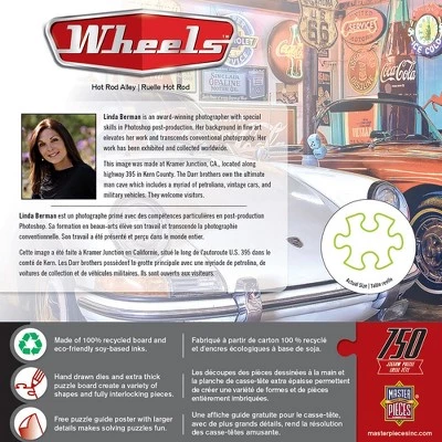 These MasterPieces 18″ x 24″ 750pc Wheels Puzzles are created from photographs taken by the very talented Linda Berman. Linda Berman is an award winning photographer with special skills in Photoshop post production. Her background in fine art elevates her work and transcends conventional photography. Her work has been exhibited and collected worldwide. The Wheels Puzzle Line features her photographs of timeless classic cars, and classic car memorabilia. To reduce their impact on our environment, the chipboard used in these puzzles is made of recycled material.