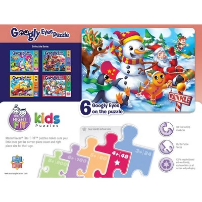This Googly Eyes Christmas puzzle is a great way to have even more fun with puzzles! Each puzzle comes with 8 pre-mounted, factory-secured wiggly and googly eyes, kids are sure to be entertained for hours! This puzzle is 48 pieces and 19 inches x 14 inches in size. Look for The Right Fit® puzzles collection and make sure your little one gets the correct piece count and size for a good challenge for their age. This puzzle is the right fit for ages 4+.
