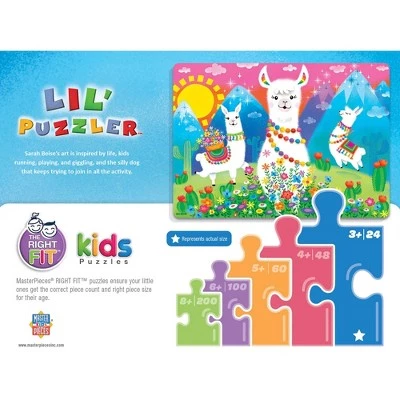 Lil’ Puzzlers puzzle Llama Love is the perfect starter puzzle for kids. Llama Love features a llama family frolicking among colorful flowers. This puzzle is 24 pieces and 19 inches x 14 inches in size. Look for The Right Fit® puzzles collection and make sure your little one gets the correct piece count and size for a good challenge for their age. This puzzle is the right fit for ages 3+.